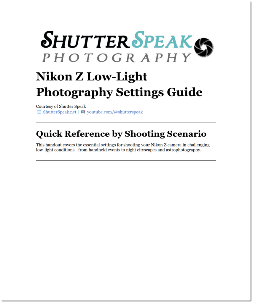 Thank you for signing up to the Shutter Speak email list—welcome to the community of Nikon Z shooters who want to level up their low-light photography. Here is your link to download the Nikon Z Low-Light Photography Settings Guide: Download the guide.